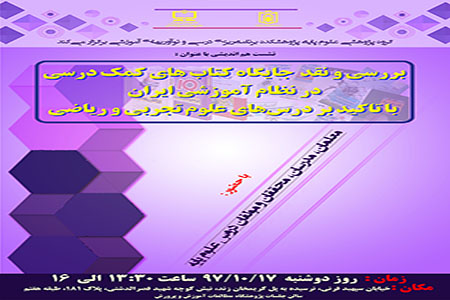 نشست هماندیشی با عنوان " بررسی و نقد جایگاه کتابهای کمک درسی در نظام آموزشی ایران با تأکید بر درسهای علوم تجربی و ریاضی " با حضور معلمان، مدرسان، محققان و مولفان دروس علوم پایه روز دوشنبه 17/10/97 ساعت 13:30 الی 16 ، در مکان : خیابان سپهبد قرنی، نرسیده به پل کریمخان زند، نبش کوچه شهید قصرالدشتی، پلاک 181، طبقه هفتم سالن جلسات پژوهشگاه مطالعات آموزش و پرورش ، برگزار میشود.